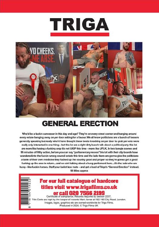 Get ready for a wild ride with Triga Films' latest release, General Erection. This provocative DVD dives into a world where canvassers aren't just looking for your vote—they're looking for something much more explicit. In this bold and edgy film, we explore a fantasy where politicians, often viewed with skepticism, are turned into the main characters in a series of steamy encounters.