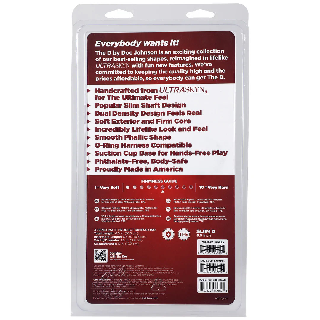 The Slim D, one of Doc Johnson's most popular models, features a comfortable width for most bodies and is available in two options: FIRMSKYN™, for a firmer feel, and dual-density ULTRASKYN™, which warms to the touch, with a soft exterior and firm core that replicates the real feel of a penis.