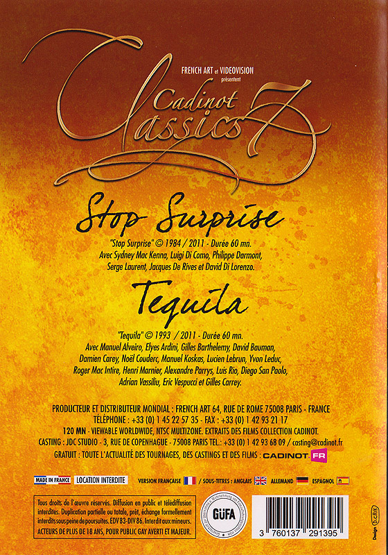 Cadinot Classics #7 - DVD Cadinot Daddies Minets Sperme Zoom × Cadinot Classics #7 - DVD Cadinot Previous Next ARTICLE NON DISPONIBLE Notre prix: 29.90 € Réf.D231RC11911 cet article me fait gagner 5 points de fidélité Cliquer ici pour voir le film en VOD! Descriptif: Lire le descriptif "Cadinot Classics 7" contient deux films sur un seul DVD explosif. Multiracial, multi orgasmique ! Deux heures avec le paradis sexuel sur terre. Stop Surprise (1984) Etrange, l'aventure qui lui est arrivée cet été, il faisait du stop, à l'aise dans son mini short, les épaules à peine couvertes par un débardeur rouge. Tequila (1993) C'est fort, c'est piquant, c'est salé… Qui, en feuilletant d'attrayants catalogues de voyage, n'est pas parti dans des rêveries sans limite ? Un cocktail explosif de physiques ambrés, capiteux et captivants à consommer sans modération ! - stop surprise - tequila Réalisateur: Jean Daniel Cadinot Informations complémentaires: Fiche technique:Zone:toutesAnnée:2011Durée:120 minNorme:NTSCChapitresMenu InteractifSon:StereoGénérique:Jean Daniel CadinotRéalisateur Catégories: Tous les DVD X Gay FrançaisTous les DVD BAREBACKDVD Cadinot En livraison gratuite*: Vous aimerez aussi dans le même studio de films x gay DVD - Cadinot: Coup de Soleil - DVD Cadinot La vigueur et la fraîcheur personnifiées. Des garçons magnifiques avec de la testostérone à revendre ne peuvent ni ne veulent retenir leurs pulsions sexuelles intenses. un film classique de Cadinot datant de 1996. De jeunes hommes se cherchent et s'... 35.50 € La Main au Feu - DVD Cadinot Dans ce DVD XXX Gay Cadinot, voyez comment le désir va vous surprendre ! Les pinèdes se consument, les campeurs se consomment, la chaleur d'un pyromane sème le désordre parmi les membres des forces de l'ordre. Entièrement tourné dans l'arrière pays c... 35.50 € Les Minets de l'info - DVD Cadinot Cinq reportages de fond propulsent sur votre écran 16 minets à faire craquer "l'audimateur". Le 20 heures réinventé par Cadinot. Gardez votre calme, Il s'agit d'un détournement.. d'information Les otages : dans un lyçée, 4 élèves sont retenus par un ... 35.50 € Le Jeu de Pistes - DVD Cadinot Une troupe de jeunes scouts livrée aux jeux interdits. Un camp de vacances devient un fabuleux terrain pour passer en revue les leçons de choses. La campagne inconnue devenait un fabuleux terrain de leçons de choses. Jeunes citadins livrés à nous-mê... 35.50 € Macadam - DVD Cadinot Un road movie saissant à travers toute la FranceUne usine désaffectée, des aires de repos et des routes de campagne émaillent le parcours initiatique de Youri, un touriste russe tout frais débarqué à Paris. Sa rencontre avec un jeune bidasse venant... 35.50 € Cadinot The Best #3 - DVD Cadinot Pas moins de 2 heures de XXX Gay dans cette troisième partie de la série 'Best of' du grand Cadinot ! Les amateurs du label porno classique français trouvent leur compte ici avec le meilleur du porno gay français des années 80 et 90 ! Dans 'Stop sur... 29.90 € Commandez aussi par téléphone: 01 30 40 15 50, (tarif local ou gratuit selon votre opérateur), du lundi au samedi, de 9H00 à 12H00 et de 13H00 à 20H00. Le samedi et le dimanche de 8H00 à 19H00 en continu. Une recherche d´article ? Ecrivez nous à Une exclusivité sur le marché des boutiques gay en France: le descriptif de chacun de nos articles fait apparaître le délai moyen d'acheminement en temps réel. Pensez à le vérifier avant toute question au service clientèle. AGayN ® est une marque déposée sous la référence 06/3426620. Les promos du moment | Votre Espace Client | Retour au menu | Conditions Générales de Vente