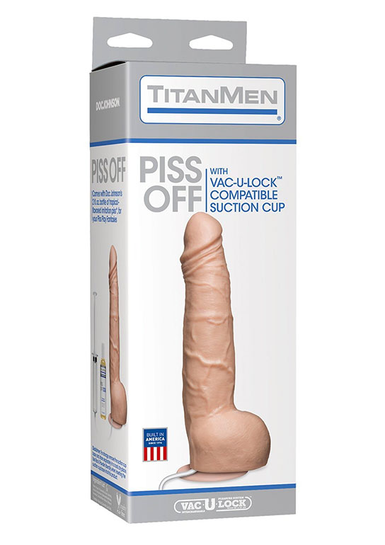Gode relié à une seringue pour le faire éjaculer. Vendu avec un flacon de liquide Piss Off (60 ml) à la saveur tropicale.