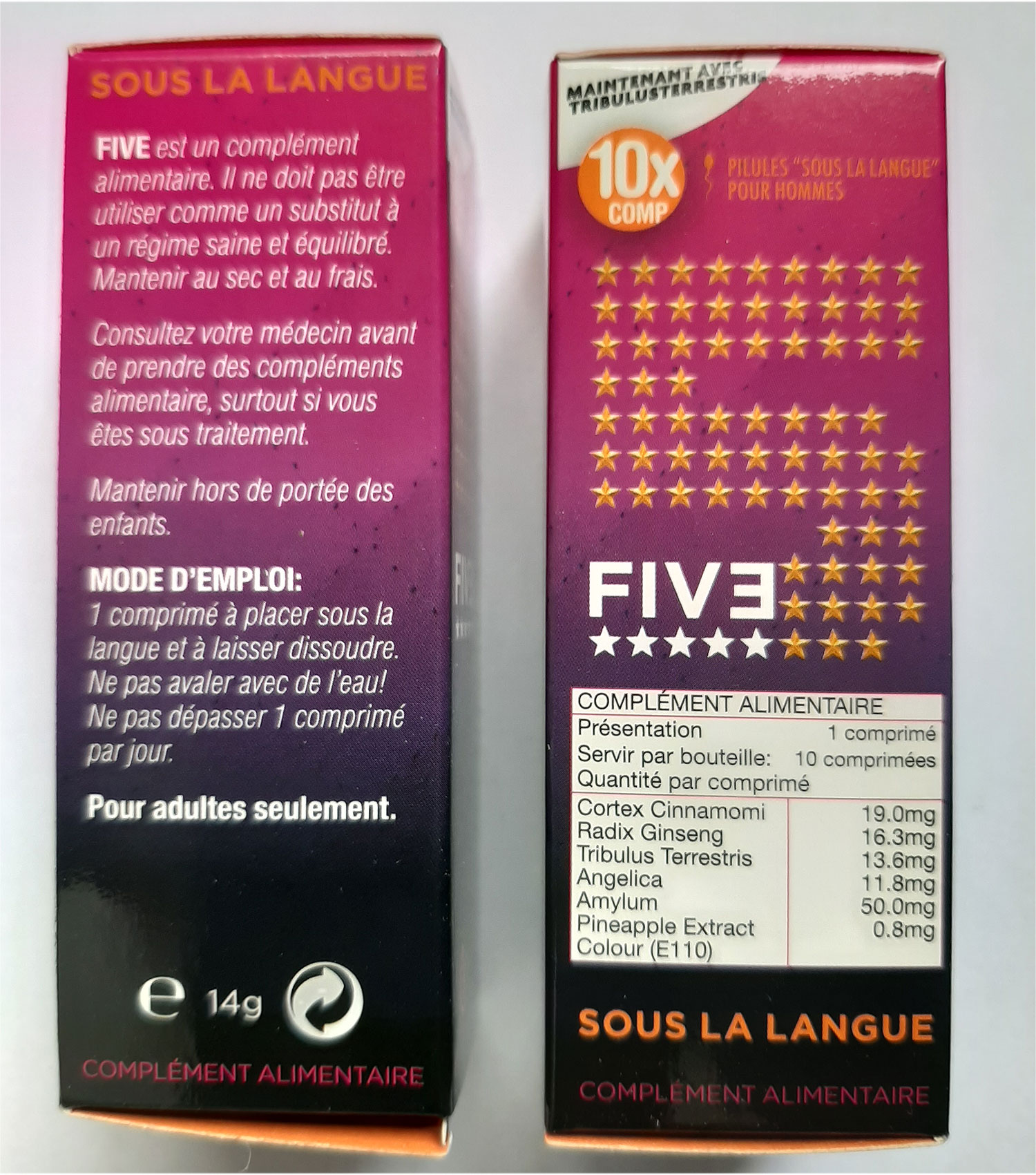 Stimulant FIVE ''5'' - Pillule érection - x2 Zoom × Stimulant FIVE ''5'' - Pillule érection - x2 Previous Next ARTICLE NON DISPONIBLEAussi disponible en : x5 x10 Notre prix: 25.90 € (12.95€/u) Réf.FIVE-2 Descriptif: Lire le descriptif Le FIVE a été créé pour être un stimulant aphrodisiaque sublingual très puissant de nouvelle génération pour homme aux extraits de plantes ! Ne pas avaler: Oui, vous avez bien lu, le FIVE se place sous la langue. Il est conçu pour optimiser vos performances sexuelles et votre érection. FIVE permet aussi un meilleur contrôle de l’éjaculation précoce et doit vous apporter érection durable. Placé sous la langue, ce produit au goût légèrement citronné/acidulé agit au plus vite que lors d'une absorption classique (en direct avec les veines, sur le même principe que les suppositoires sont les plus efficaces dans le rectum). Si vous ne voulez qu'un coup de boost, et sans alcool, ni trop de nourriture absorbée, nous vous conseillons de diviser en deux le comprimé. Attention: les effets peuvent varier d'une personne à l'autre, et selon les moments de prise de la capsule. Certains trouvent des effets au bout de 20 minutes, d'autres au bout de 50 minutes . Informations complémentaires: ♦ Qté:2 - Type:Pillules♦ Consommable Comestible : Compléments (x 2)♦ Composition:Ingrédients actifs: Amylum (50 mg), Ginseng (16.3 mg), Tribulus Terrestri (13.6 mg), Angelica (11.8 mg), extrait d'ananas (0.8 mg). (en cours de réécriture - dosage en % ou mg sur la face B de la fiche article)♦ Emploi:Cap à placer sous la langue - ne pas ingérer directement. A réserver aux adultes. Ne pas utiliser si un traitement médicamenteux est en cours. Ne pas donner à la femme enceinte. Catégories: Compléments alimentaires Lubrifiant BIO ''Super'' - HOT Productions - 100 ml 16.70 € Lubrifiant Eros Bio Vegan (flacon) - 100 ml 14.10 € Lubrifiant Eros Aqua - 250 ml 12.10 € Commandez aussi par téléphone: 01 30 40 15 50, (tarif local ou gratuit selon votre opérateur), du lundi au samedi, de 9H00 à 12H00 et de 13H00 à 20H00. Le samedi et le dimanche de 8H00 à 19H00 en continu. Une recherche d´article ? Ecrivez nous à Une exclusivité sur le marché des boutiques gay en France: le descriptif de chacun de nos articles fait apparaître le délai moyen d'acheminement en temps réel. Pensez à le vérifier avant toute question au service clientèle. AGayN ® est une marque déposée sous la référence 06/3426620. Les promos du moment | Votre Espace Client | Retour au menu | Conditions Générales de Vente