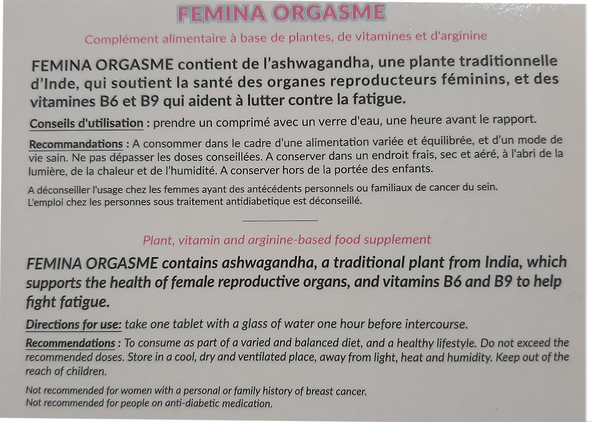 Intex-Tonic ''Femina Orgasme'' (pour Femme) - x30 Zoom × Intex-Tonic ''Femina Orgasme'' (pour Femme) - x30 Previous Next ARTICLE NON DISPONIBLE Notre prix: 24.50 € (0.82€/u) Réf.850 103 Descriptif: Lire le descriptif Femina Orgasme": vous allez faire beaucoup d'heureux ou d'heureuses vous adoptez la solution pour un orgasme certainement plus puissant et mieux ressentis. Vous vous sentirez plus en forme et à l'aise dans votre corps avec l'apport des vitamines B6. La vitamine B6 est essentielle à la production de divers neuromédiateurs ou hormones : sérotonine, dopamine, adrénaline, noradrénaline. Cet amplification d'orgasmes féminins est à portée de clics. Informations complémentaires: ♦ Qté:30 - Type:Pillules♦ Consommable Comestible : Compléments (x 30)♦ Composition:Cellulose microcristalline et phosphate tricalcique, extrait sec de muira puama (Ptychopetalum olacoïdes, [nano]), L arginie chlorhydrate, extrait sec de damiana (Turnera diffusa afrodisiaca, [nano]), extrait sec de maca (Lepidium meyenii, [nano]), extrait sec d?ashwagandha (Withania somnifera), extrait sec de gingembre (Zingiber officinale,[nano]), pelliculage (épaississants : hypromellose et hydroxypropylcellulose, anti-agglomérant : talc, colorants : carbonate de calcium et rouge carmin), acide folique, anti-agglomérants : stéarate de magnésium et silice [nano], chlorhydrate de pyridoxine.♦ Emploi:Conseils d'utilisation : prendre un comprimé avec un verre d?eau, une heure avant le rapport. Catégories: Compléments alimentaires Anal Lube - Cobeco - 1.0 l 29.90 € Lubrifiant Eros Silk (flacon) - 1.0 l 69.90 € Pjur SuperHero - Spray performance (pour homme) - 20 ml 19.75 € Commandez aussi par téléphone: 01 30 40 15 50, (tarif local ou gratuit selon votre opérateur), du lundi au samedi, de 9H00 à 12H00 et de 13H00 à 20H00. Le samedi et le dimanche de 8H00 à 19H00 en continu. Une recherche d´article ? Ecrivez nous à Une exclusivité sur le marché des boutiques gay en France: le descriptif de chacun de nos articles fait apparaître le délai moyen d'acheminement en temps réel. Pensez à le vérifier avant toute question au service clientèle. AGayN ® est une marque déposée sous la référence 06/3426620. Les promos du moment | Votre Espace Client | Retour au menu | Conditions Générales de Vente