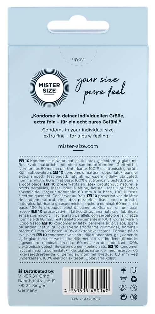 Préservatifs Mister Size transparents et très fins en latex de caoutchouc naturel avec revêtement et réservoir de lubrifiant.