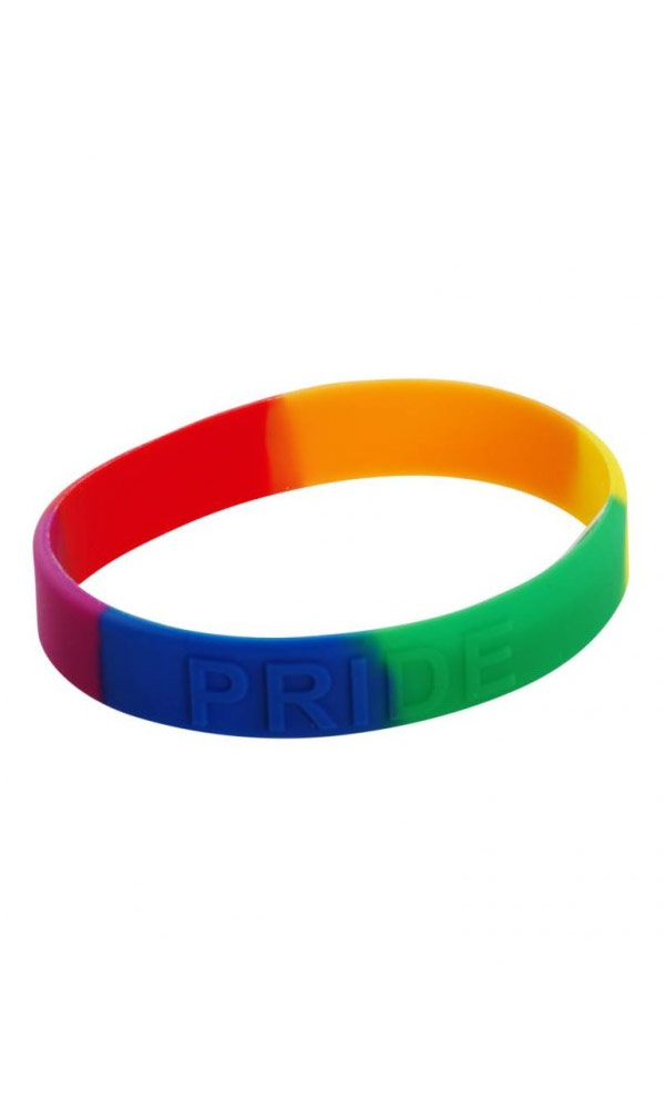 Bracelet Rainbow fabriqué en silicone, imprimé: mot Pride.