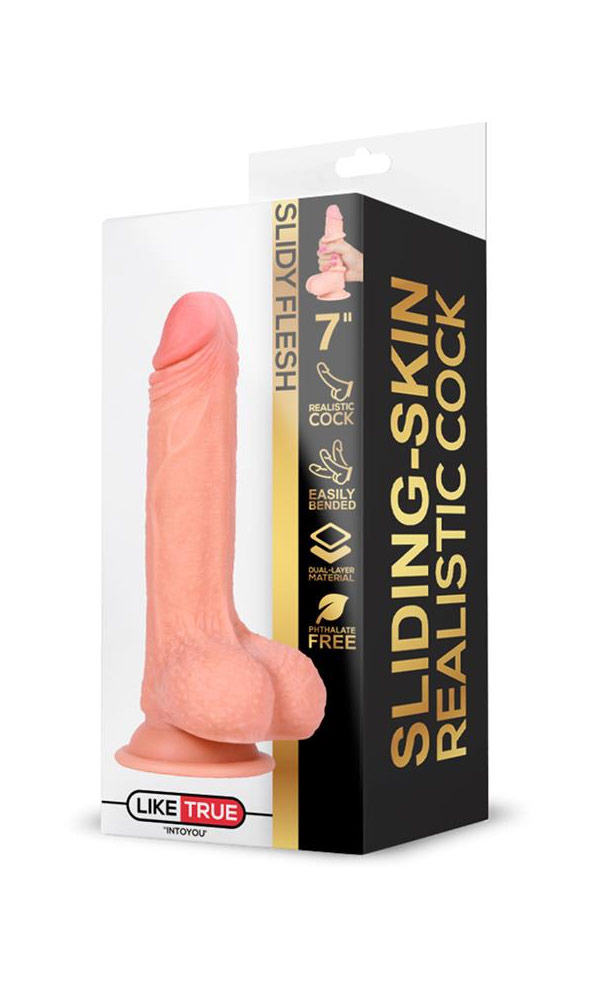 Ce gode réaliste possède une double couche, ce qui le rend flexible et très agréable à utiliser. Au bout, un gland arrondi, rose et duveteux se fraiera un chemin jusqu'au corps réaliste de Slidy pour vous combler de plaisir. Pour ajouter encore plus de réalisme, vous trouverez, si possible, des testicules texturés, idéaux pour une délicieuse prise en main.