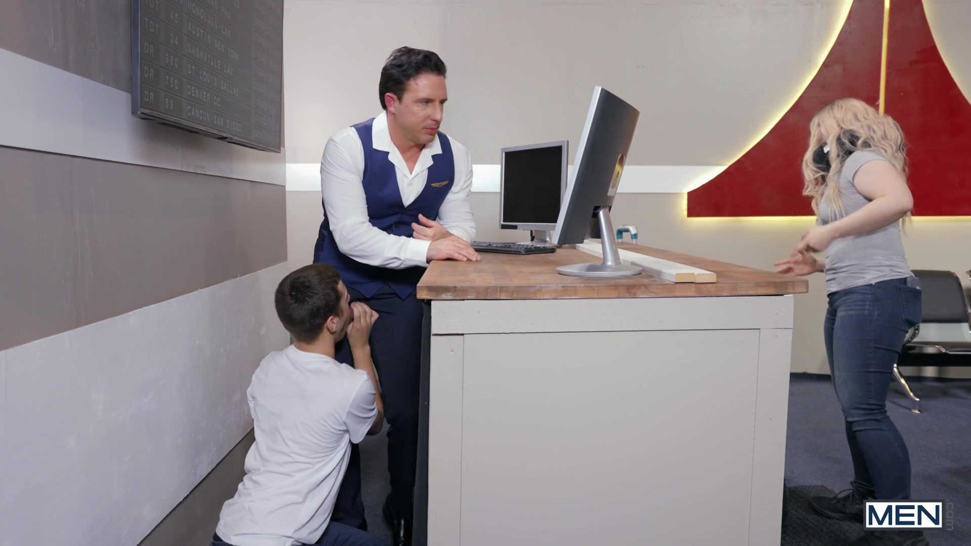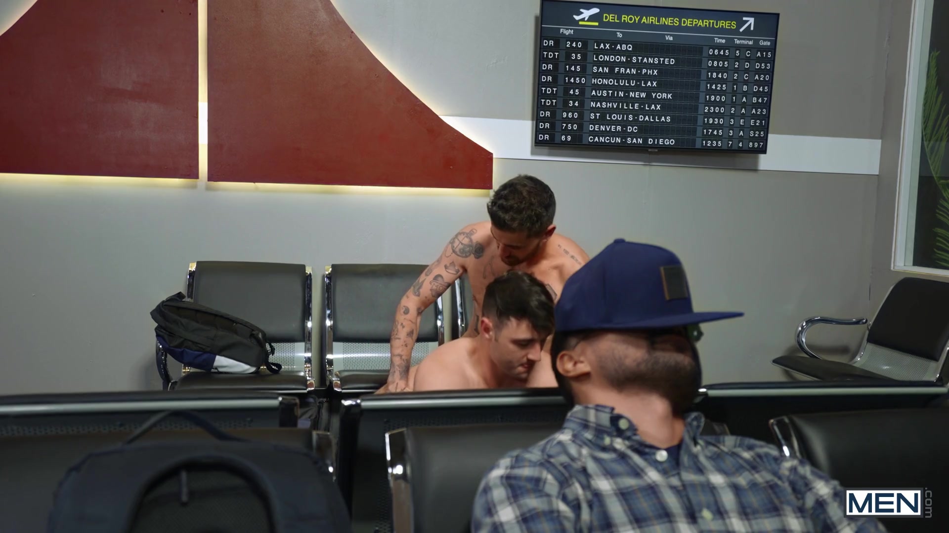 Attendre à l'aéroport est ennuyeux, alors quand le couple Chris Damned et Michael Boston s'excite, Chris s'agenouille sournoisement pour sucer la bite de Michael, observé par le mignon agent de la porte d'embarquement ! L'employé se lève pour avoir une meilleure vue lorsque le couple est bloqué par des bagages, mais Michael se cache derrière les valises pendant que son homme lui fait du rentre-dedans. Les gars se font repérer lorsque Michael chevauche Chris à l'envers, et lorsque le propriétaire des bagages s'éloigne, l'agent d'embarquement profite du spectacle, sortant sa bite et la branlant tout en regardant Chris baiser Michael en levrette sur le sol. C'est tellement bon quand Michael chevauche Chris et se frotte à sa bite, il supplie son homme de l'enculer plus fort dans le mish, et bientôt les deux gars sont en train de jouir !