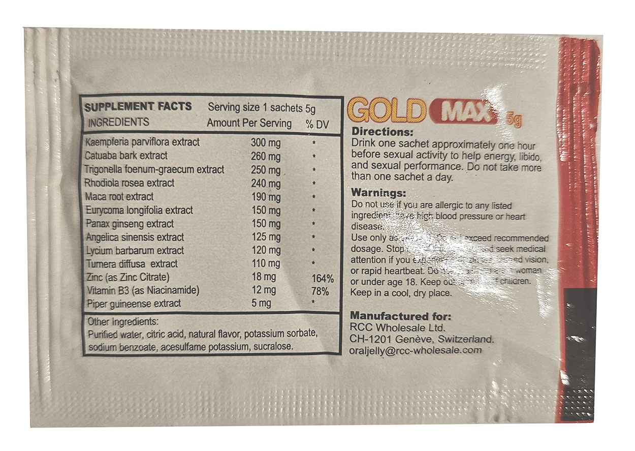 Gold Max Oral Jelly - Gelée - x7 Zoom × Gold Max Oral Jelly - Gelée - x7 Previous Next Article en stock | Disponible de suite Notre prix: 33.90 € (4.84€/u) ACHETER CETARTICLE Réf.GMOJ07 Descriptif: GoldMAX Oral Jelly est une toute nouvelle et brillante solution naturelle à base de plantes pour les hommes qui souhaitent soutenir et améliorer leurs performances sexuelles ! Des érections plus dures et plus fortes. Permet aux hommes d'avoir des orgasmes plus puissants. GoldMAX Oral Jelly est un produit naturel conçu pour aider à traiter la dysfonction érectile et stimuler les performances sexuelles. Il se présente sous la forme de sachets de gelée qui se dissout dans la bouche. Selon le fabricant, comment prendre GoldMAX Oral Jelly: Il faut le prendre 30 minutes avant le rapport sexuel. Pour ce faire, vous placez la gelée dans votre bouche, où elle se dissout, et est absorbée. Pourquoi une gelée orale ? Une gelée orale est un gel dissoluble qui est censé être plus facile à avaler qu'une pilule. Les stimulants sexuels vendus sous forme de gelée buccale agissent plus rapidement et sont plus faciles à prendre que les gélules conventionnelles. Informations complémentaires: ♦ Qté:7 - Forme:Sachet - Type:Jelly♦ Consommable Comestible : Compléments (x 7)♦ Date limite utilisation: 05/2028♦ Composition:INGREDIENTS mg/sachet Kaempferia Parviflora extract: 300.00, Catuaba Bark extract: 260.00, Trigonella Foenum-graecum extract: 250.00, Rhodiola Rosea extract: 240.00, Maca Root extract: 190.00, Eurycoma Longifolia extract: 150.00, Panax Ginseng extract: 150.00, Angelica Sinensis extract: 125.00, Lycium Barbarum extract: 120.00, Turnera Diffusa extract: 110.00, Zinc (as Zinc Citrate): 18.00, Vitamin B3 (as Niacinamide): 12.00, Piper Guineense extract: 5.00, Citric Acid, Natural Flavouring, Potasssium Sorbate, Sodium Benzoate, Acesulfame Potassium, Sucralose♦ Emploi:A placer dans la bouche / sous la langue et attendre son absorption. Ne pas dépasser un sachet/jour.♦ Précautions:Toujours demander l'avis à votre médecin généraliste avant de commencer un traitement, et de vérifier avec lui s'il n'y a pas de contre indication avec un éventuel traitement en cours. Ne pas donner à la femme enceinte. Tenir hors de portée des enfants. Interdit aux moins de 18 ans. Ajouterau panier Catégories: Compléments alimentairesAphrodisiaques - PilulesNouveautés et Actus Sextoys Lubrifiant Eros Bio Vegan (flacon) - 50 ml 5.79 € Lubrifiant Just Glide ''Classic'' - 1.0 l 29.50 € Lubrifiant Porn Sperm - Sperme artificiel - 250 ml 13.10 € Commandez aussi par téléphone: 01 30 40 15 50, (tarif local ou gratuit selon votre opérateur), du lundi au samedi, de 9H00 à 12H00 et de 13H00 à 20H00. Le samedi et le dimanche de 8H00 à 19H00 en continu. Une recherche d´article ? Ecrivez nous à Une exclusivité sur le marché des boutiques gay en France: le descriptif de chacun de nos articles fait apparaître le délai moyen d'acheminement en temps réel. Pensez à le vérifier avant toute question au service clientèle. AGayN ® est une marque déposée sous la référence 06/3426620. Les promos du moment | Votre Espace Client | Retour au menu | Conditions Générales de Vente