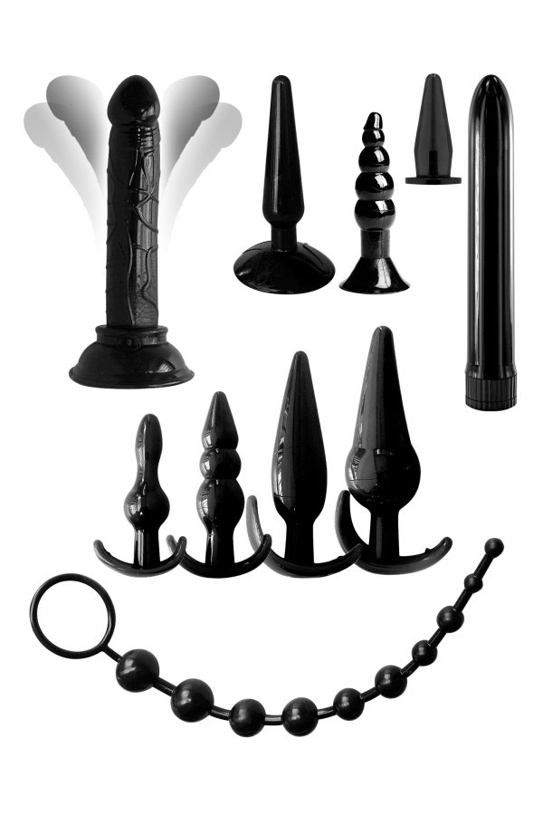 Découvrez le coffret d'initiation Sextoys, avec une variété de buttplugs et de godes de toutes formes et tailles, tous en élégante couleur noire.