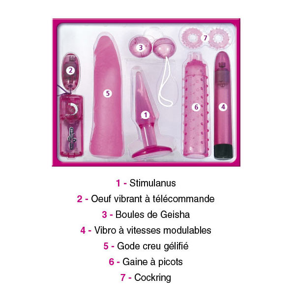 Tous transparents, ils offrent un toucher de silicone très sensuel (seuls le vibromasseur et l'œuf vibrant sont en texture rigide). Au centre du coffret, nous trouvons le plug flexible dont le profil très doux est conçu pour les joies anales (1). Plus à droite, le vibromasseur à vitesse variable est l'instrument clé du plaisir (4). On peut le coiffer d'une gaine réaliste qui imite le pénis à merveille (5), ou bien d'une gaine stimulante à picots (6). Un peu au dessus, se situent les boules de geisha en matière souple. Insérées dans le vagin, elles procurent un massage divin grâce à l’effet des billes internes qui cliquètent aux parois (3). Osez d'autres jeux avec l'œuf vibrant et sa télécommande à vitesse variable (2). Dans le cas d’étreintes réelles, monsieur enfilera à la base de la verge un anneau élastique au choix qui renforce l’érection, diffère l’éjaculation, et avive les sensations (7). Pour les sextoys intrusifs, vous optimiserez le contact en utilisant un lubrifiant à base d’eau (réf : 800123).