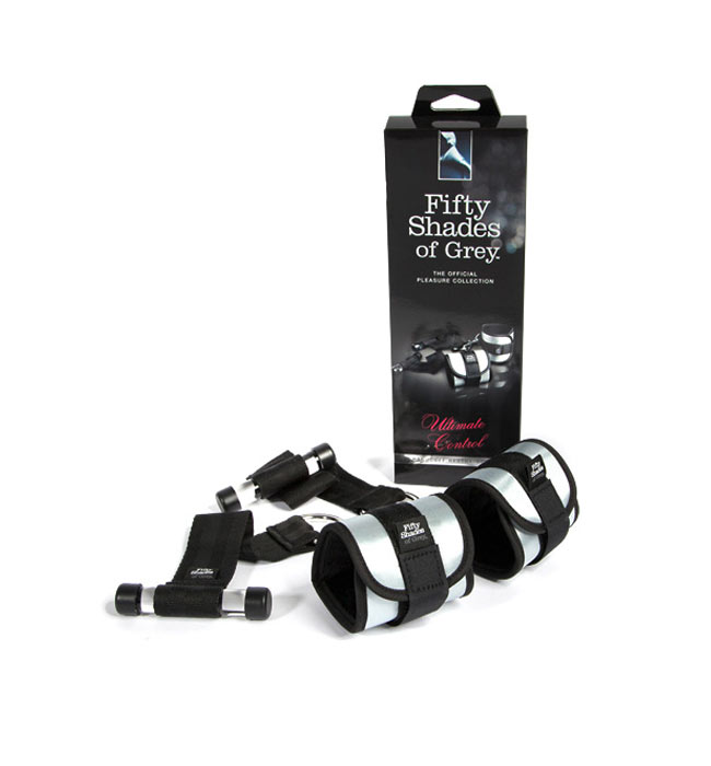 With attached black straps and an acrylic stick on their ends. Hand cuffs variably adjustable by velcro. Black-silver coloured. Length of each cuff without fastener 24 cm. Length of each strap 25 cm.