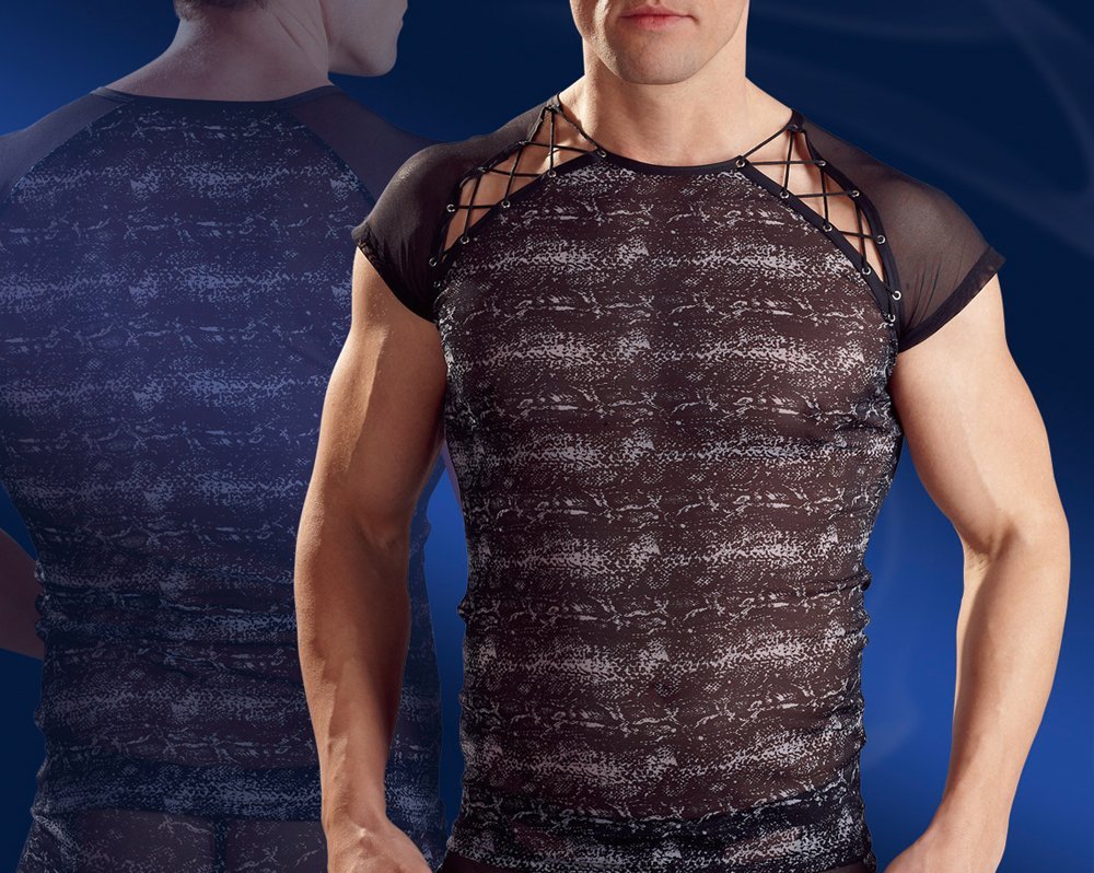 Mod the unique and not found elsewhere in France. Made of mesh with a transparent fabric and a print that resembles the skin of reptiles. Color Black / Gray. Short sleeves with decorative cord on the shoulders.