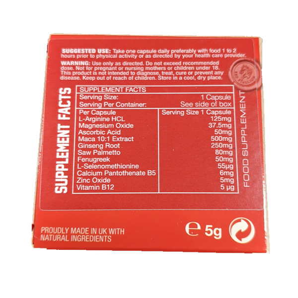 L-Arginine HCL 125mg Magnesium Oxide 37.5mg Ascorbic Acid 50mg Maca 10:1 Extract 500mg Ginseng Root 250mg Saw Palmetto 80mg Fenugreek 50mg L-Selenomethionine 55?g Calcium Pantothenate B5 6mg Zinc Oxide 5mg Vitamin B12 5 ?g