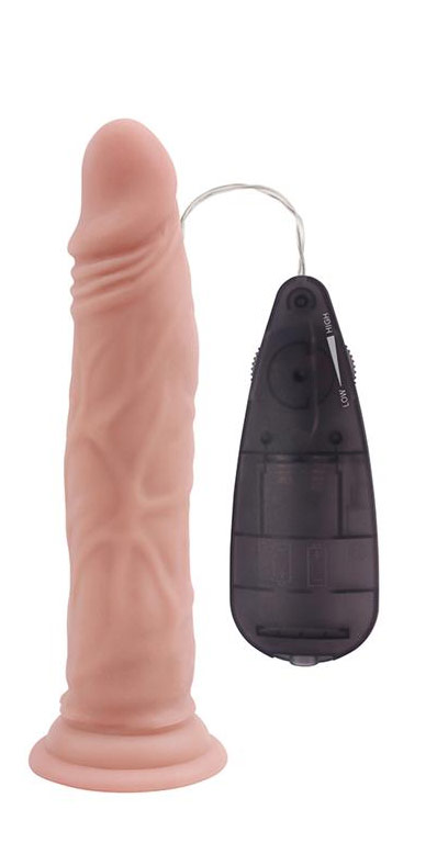 Realistic vibrating dildo. It has a remote control with which you can travel between its intensities using its rotating wheel. Its body is realistic and it has a suction cup on the base so you can put it on almost any smooth surface.